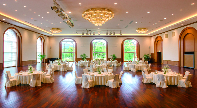 開放感あふれる7mの天井をもつ、エリアNO.1の広さを誇るメインホール。大きな窓から自然な光が射し込むホールで、シェフこだわりの料理をご提供いたします。ご披露宴をはじめ様々な目的とご予算に応じて各種ご宴会も承ります。